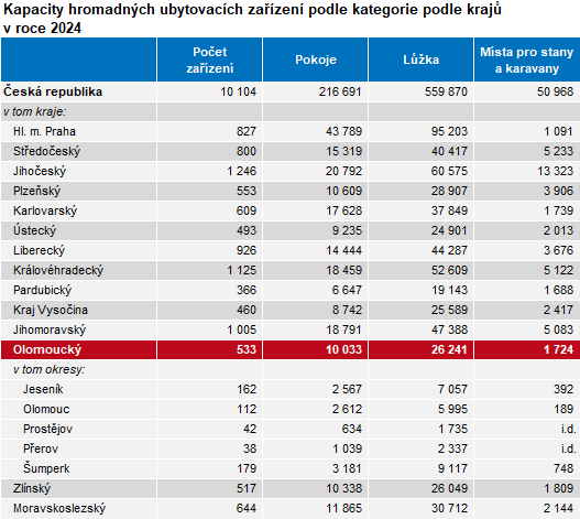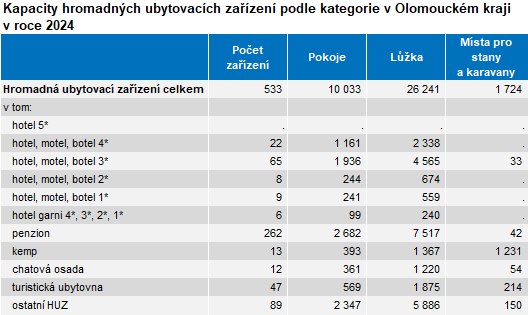V roce 2024 bylo v Registru ubytovacích zařízení na území Olomouckého kraje evidováno 533 hromadných ubytovacích zařízení (HUZ). V porovnání s loňským rokem se jejich počet snížil o 8 subjektů, tj. pokles o 1,5 %. Hromadná ubytovací zařízení v kraji nabízela celkem 26 241 lůžek v 10 033 pokojích. Na republikovém úhrnu 10 104 zařízení se Olomoucký kraj podílel 5,3 % a v rámci mezikrajského srovnání byl 5. nejnižší. Nejvyšším počtem HUZ disponoval Jihočeský kraj s 1 246 zařízeními (12,3% podíl na úhrnu ČR) následovaný Královéhradeckým krajem s 1 125 zařízeními (11,1% podíl na republikovém celku). Posledním krajem s počtem HUZ nad 1 000 byl Jihomoravský kraj (1 005 zařízení s podílem 9,9 %).