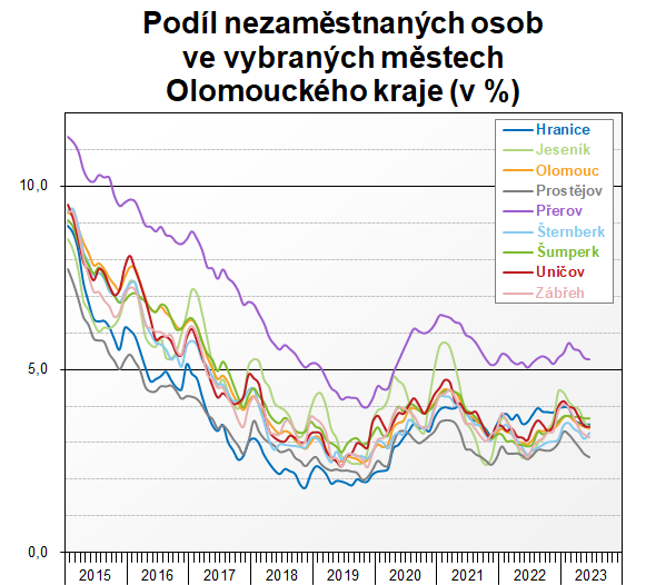 Ve městě Olomouci vzrostl podíl nezaměstnaných osob k 30. 6. 2023 na 3,4 %. V Prostějově se při stejném srovnání mírně zvýšil na 2,6 % a v Přerově vzrostl na 5,3 %. Mezi 31 městy Olomouckého kraje byly nejnižší podíly zjištěny v Plumlově (1,9 %), Štěpánově (2,0 %) a Konici (2,2 %) Na opačném pólu pořadí se umístila města Javorník (6,5 %), Vidnava (5,3 %) a Přerov (5,3 %). V devíti obcích Olomouckého kraje byla na konci června nezaměstnanost nulová (Bousín, Dolní Těšice, Hačky, Lhotka, Mutkov, Provodovice, Radíkov, Vincencov a Vitčice). Nejvyšší nezaměstnanost příslušela obcím Hraničné Petrovice (11,9 %), Uhelná (11,6 %) a Vlčice (10,1 %).