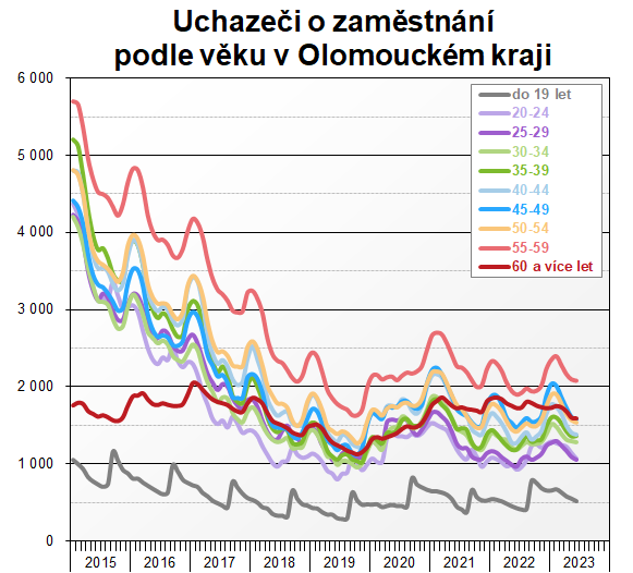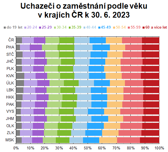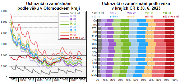 Pro Olomoucký kraj bylo k 30. 6. 2023 typické nižší zastoupení uchazečů ve věku do 44 let (49,5 %), které bylo pod republikovým průměrem (51,3 %). Zvýšený podíl byl naopak zaznamenán především u věkové skupiny 45 až 59 let (38,6 %). To se promítlo do vyššího průměrného věku uchazeče v Olomouckém kraji (43,8 let), který byl nad celostátním průměrem (43,4 let). Vyšší průměrný věk uchazeče vykázal v ČR pouze kraj Moravskoslezský a Zlínský.