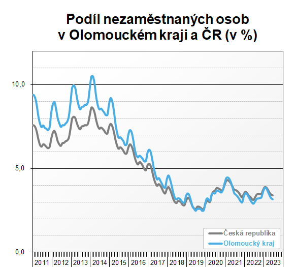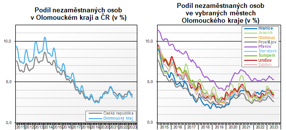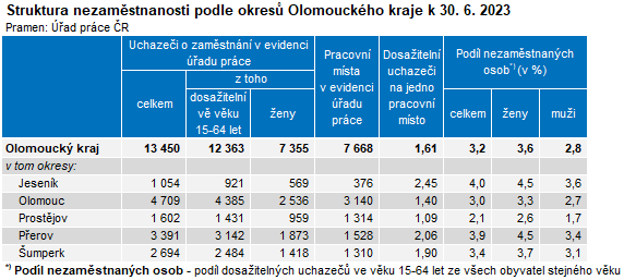 Podle údajů Úřadu práce ČR dosáhl k 30. 6. 2023 podíl nezaměstnaných osob v Olomouckém kraji 3,2 %. Meziměsíčně došlo k obvyklému sezónnímu snížení, a to o 0,1 procentního bodu (p. b.). V meziročním srovnání došlo k růstu o 0,3 p. b., na kterém se podílely čtyři z pěti okresů v kraji. Nejvíce se v porovnání s 30. 6. 2022 zvýšil podíl nezaměstnaných osob v okresech Šumperk a Jeseník (shodně o 0,5 p. b.). Mírné meziroční snížení nastalo pouze na Přerovsku.