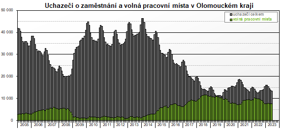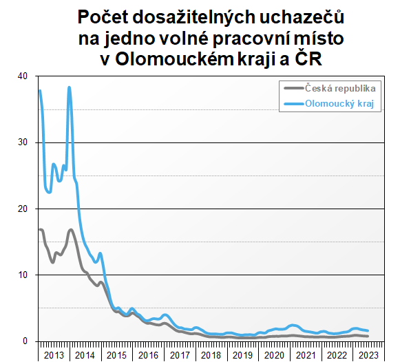 Na trhu práce v Olomouckém kraji převyšovala na konci června poptávka nad nabídkou. Na jedno volné pracovní místo se v průměru hlásilo 1,61 dosažitelného uchazeče. Meziměsíčně se zjištěný počet snížil o 0,07 dosažitelného uchazeče, meziročně vzrostl o 0,45 dosažitelného uchazeče. V okrese Jeseník bylo nově evidováno 2,45 dosažitelného uchazeče na 1 volné pracovní místo, v okrese Přerov 2,06, v okrese Šumperk 1,90, v okrese Olomouc 1,40 a v okrese Prostějov 1,09. Republikový průměr činil 0,79 dosažitelného uchazeče na 1 volné pracovní místo.