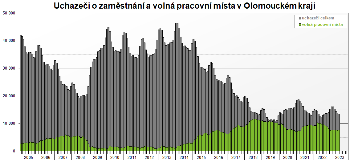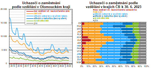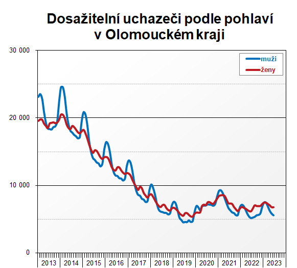Úřad práce ČR evidoval k 30. 6. 2023 v Olomouckém kraji 13,5 tis. uchazečů o zaměstnání. Z tohoto počtu bylo 7,4 tis. žen (tj. 54,7 %). Nejvyšší zastoupení žen mezi nezaměstnanými v kraji vykázal okres Prostějov (59,9 %), jejich nejnižší podíl naopak charakterizoval okres Šumperk (52,6 %). Z celkového počtu uchazečů bylo 4,2 % absolventů a mladistvých a 16,3 % osob se zdravotním postižením. K 30. 6. 2023 bylo v kraji evidováno 12,4 tis. dosažitelných uchazečů (tj. 91,9 % z celku).