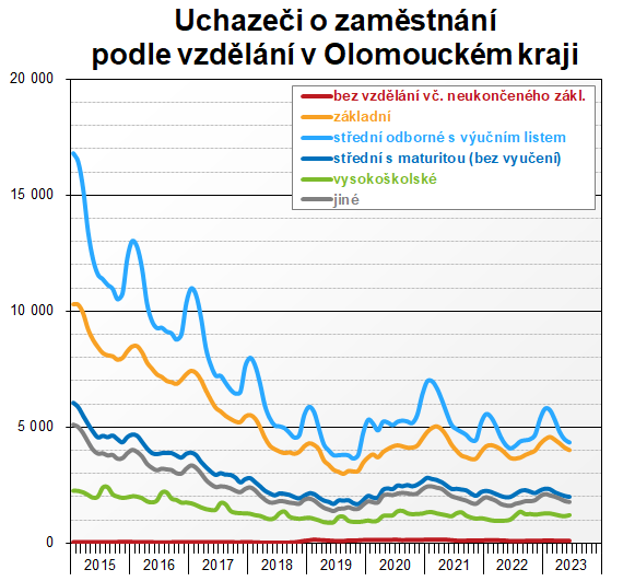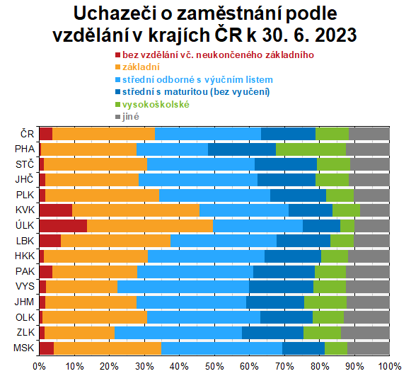 Základní vzdělání mělo v kraji 4,0 tis. registrovaných uchazečů (tj. 29,9 %; v ČR 29,1 %). Střední odborné vzdělání s výučním listem charakterizovalo 4,3 tis. uchazečů (tj. 32,3 %; v ČR 30,5 %) a úplné střední s maturitou (bez vyučení) 2,0 tis. uchazečů (tj. 14,8 %; v ČR 15,4 %). Akademický či vědecký titul mělo 1,2 tis. registrovaných uchazečů (tj. 8,9 %; v ČR 9,5 %). Podle hlavních tříd zaměstnání převažovali mezi uchazeči pomocní a nekvalifikovaní pracovníci (4,7 tis., tj. 35,1 %) a pracovníci ve službách a prodeji (3,0 tis., tj. 22,6 %).