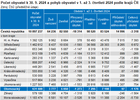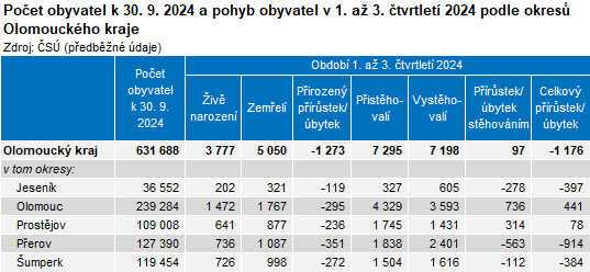 Podle předběžných údajů ČSÚ žilo k 30. 9. 2024 v Olomouckém kraji 631 688 obyvatel. V porovnání se stavem k 1. 1. 2024 byl jejich počet nižší o 1 176 osob, tj. o 2,5 osob na 1 000 obyvatel středního stavu. Olomoucký kraj se tím zařadil k většině krajů České republiky, ve kterých během 1. až 3. čtvrtletí 2024 počet obyvatel poklesl. Opačný trend zaznamenala pouze Praha a kraje Středočeský a Jihomoravský. V rámci Olomouckého kraje se počet obyvatel zvýšil v okresech Olomouc (o 441 osob na 239,3 tis.) a Prostějov (o 78 osob na 109,0 tis.). K poklesu počtu obyvatel došlo v okresech Přerov (o 914 osob na 127,4 tis.), Jeseník (o 397 osob na 36,6 tis.) a Šumperk (o 384 osob na 119,5 tis.). Všechny okresy Olomouckého kraje charakterizoval ve sledovaném období úbytek populace přirozenou měnou, přičemž kladné migrační saldo bylo pouze v okresech Olomouc a Prostějov.