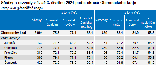 Podle předběžných údajů vydaly věcně příslušné soudy v kraji v průběhu 1. až 3. čtvrtletí 2024 rozhodnutí o 869 rozvodech. V přepočtu se jednalo o 1,8 rozvodů na 1 000 obyvatel, což bylo mírně pod republikovým průměrem (1,9 ‰). Nejvyšší rozvodovost charakterizovala okresy Jeseník a Olomouc (shodně 2,0 ‰), naopak nejnižší rozvodovost náležela okresu Prostějov (1,5 ‰). Většina rozvodů byla první v pořadí, a to jak pro muže (83,1 %), tak pro ženy (81,9 %). V 510 případech byla rozvedena manželství s nezletilými dětmi (tj. 58,7 % z celkového počtu).