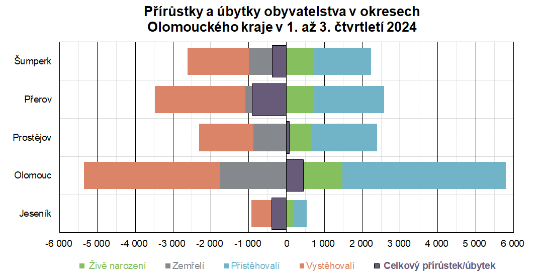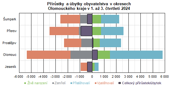 Stav krajské populace se v průběhu 1. až 3. čtvrtletí 2024 snížil navzdory kladnému migračnímu saldu. Rozdíl mezi počtem přistěhovalých a vystěhovalých byl sice kladný, ale činil pouze 97 osob. V relativním pohledu dosáhl hodnoty 0,2 osoby na 1 000 obyvatel středního stavu. Zatímco počet přistěhovalých se meziročně snížil, počet vystěhovalých se naopak zvýšil. Kladné migrační saldo vykázal Olomoucký kraj během prvních třech čtvrtletí již 4. rokem v řadě. Zatímco s ostatními kraji České republiky měl v 1. až 3. čtvrtletí 2024 migrační saldo záporné, s cizinou bylo migrační saldo Olomouckého kraje kladné. Početní převaha přistěhovalých nad vystěhovalými charakterizovala okresy Olomouc (o 736 osob) a Prostějov (o 314 osob). Opačná převaha byla sledována v okresech Přerov (o 563 osob), Jeseník (o 278 osob) a Šumperk (o 112 osob). V relativním měřítku příslušela nejvyšší hodnota přírůstku stěhováním okresu Olomouc (4,1 osob na 1 000 obyvatel) a nejvyšší hodnota úbytku stěhováním okresu Jeseník (−10,1 osob na 1 000 obyvatel).