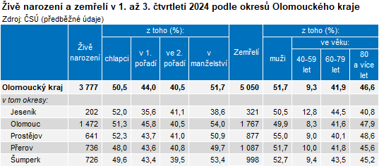 Rozdíl mezi počtem živě narozených a zemřelých byl v 1. až 3. čtvrtletí 2024 v Olomouckém kraji záporný a činil −1 273 osob. V relativním přepočtu dosáhl hodnoty −2,7 osob na 1 000 obyvatel středního stavu. V meziročním pohledu se snížil jak počet živě narozených dětí, tak počet zemřelých. Dlouhodobý trend záporné přirozené měny tak zůstal zachován. Početní převaha zemřelých nad živě narozenými charakterizovala všechny okresy v kraji, tj. okresy Přerov (−351 osob), Olomouc (−295 osob), Šumperk (−272 osob), Prostějov (−236 osob) i Jeseník (−119 osob). V relativním vyjádření náležely mezní hodnoty přirozeného úbytku okresům Jeseník (−4,3 osob na 1 000 obyvatel) a Olomouc (−1,6 osob na 1 000 obyvatel).