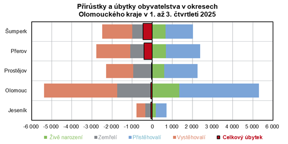 Stav krajské populace se v průběhu 1. až 3. čtvrtletí 2025 snížil navzdory kladnému migračnímu saldu. Rozdíl mezi počtem přistěhovalých a vystěhovalých byl kladný a činil 597 osob. V relativním pohledu dosáhl hodnoty 1,3 osob na 1 000 obyvatel středního stavu. V meziročním porovnání klesly počty jak přistěhovalých, tak vystěhovalých. Kladné migrační saldo vykázal Olomoucký kraj během prvních třech čtvrtletí již 5. rokem v řadě. Zatímco s ostatními kraji České republiky měl v 1. až 3. čtvrtletí 2024 migrační saldo záporné, s cizinou bylo migrační saldo Olomouckého kraje kladné. Početní převaha přistěhovalých nad vystěhovalými charakterizovala okresy Prostějov (3,6 ‰), Jeseník (3,5 ‰), Olomouc (1,8 ‰) a Přerov (0,1 ‰). Opačná převaha byla sledována pouze v okrese Šumperk (−1,5 ‰). V absolutním měřítku příslušely mezní hodnoty přírůstku stěhováním okresům Olomouc (330 obyvatel) a Šumperk (−135 obyvatel).