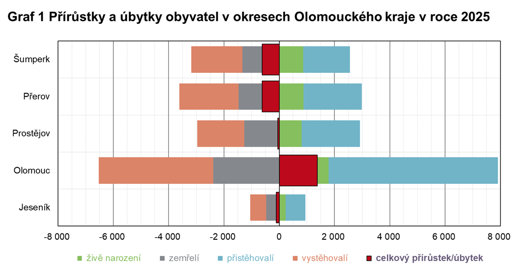 Podle předběžných údajů ČSÚ žilo k 31. 12. 2025 v Olomouckém kraji 631 480 obyvatel. V porovnání se stavem k 1. 1. 2025 byl jejich počet nižší o 20 osob, tj. o 0,03 osob na 1 000 obyvatel středního stavu. Úbytek populace charakterizovalo 9 ze 14 krajů. Opačný trend zaznamenaly kraje Středočeský, Hl. m. Praha, Jihomoravský, Pardubický a Plzeňský. V rámci Olomouckého kraje se počet obyvatel snížil ve 4 z 5 okresů. Relativně (i absolutně) nejvyšší populační úbytky nastaly na Šumpersku (o 5,2 ‰ na 118,8 tis.) a Přerovsku (o 4,9 ‰ na 126,7 tis.). Jediným okresem v kraji, ve kterém počet obyvatel vzrostl, se stal nejlidnatější okres Olomouc (o 5,8 ‰ na 240,8 tis). Souběh záporného přirozeného přírůstku a záporného přírůstku stěhováním charakterizoval území okresů Šumperk a Přerov. Ve zbývající trojici okresů Olomouc, Prostějov a Jeseník nastala záporná přirozená měna a kladné migrační saldo.