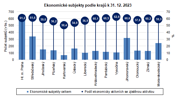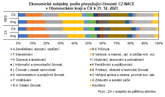 Je však nutno upozornit, že v Registru ekonomických subjektů jsou uvedeny všechny jednotky bez ohledu na jejich ekonomickou aktivitu. Za subjekty se zjištěnou ekonomickou aktivitou je považován ten, který je plátcem daně z příjmů, daně z přidané hodnoty nebo platí pojistné na sociální zabezpečení za zaměstnance či jako osoba samostatně výdělečně činná. Ke konci roku 2023 byla aktivita v Olomouckém kraji zjištěna u 57,8 % z celkového počtu subjektů.