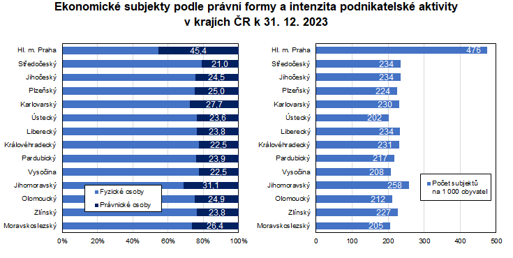 V celé ČR podnikalo ke konci roku 2023 celkem 2 800 294 subjektů. Nejvíce subjektů sídlilo v hl. m. Praze (655 855), nejméně se jich nacházelo v Karlovarském kraji (67 824). Počet ekonomických subjektů v Olomouckém kraji tvořil 4,8 % republikového celku.