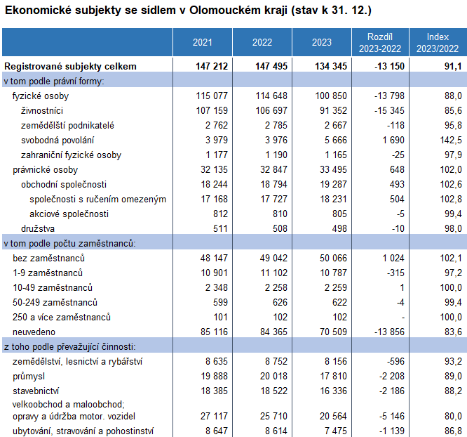 Počet ekonomických subjektů v Olomouckém kraji se k 31. 12. 2023 meziročně výrazně snížil o 13 150 jednotek, tj. o 8,9 %, na 134 345 subjektů.