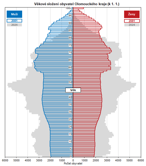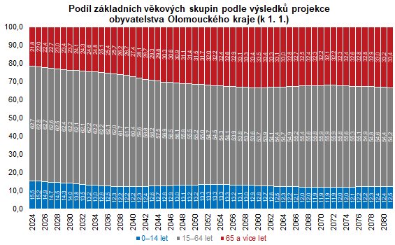 Zásadní proměnou projde věkové složení obyvatelstva. K 1. lednu 2024 žilo v kraji 98,3 tis. dětí ve věku 0 až 14 let (15,5 % z celku), 396,7 tis. osob v produktivním věku 15 až 64 let (62,7 %) a 137,8 tis. osob ve věku 65 a více let (21,8 %). Počet dětí ve věku 0 až 14 let se bude podle očekávaného vývoje v Olomouckém kraji zřetelně snižovat. Výjimkou by mělo být zejména období let 2040 až 2050, ve kterém se předpokládá mírný růst dětské složky v krajské populaci. K 1. lednu 2081 by v kraji mělo žít 58,8 tis. dětí ve věku 0 až 14 let, tzn. o 40,2 % méně než na počátku roku 2024. V případě takového vývoje by se zastoupení dětí snížilo z 15,5 % v roce 2024 na 12,5 % v roce 2081. Nejnižší podíl dětské složky v populaci můžeme očekávat v letech 2069 až 2072, a to 11,9 %. Počet osob ve věku 65 a více let by měl trvale růst až do roku 2057, ve kterém dosáhne svého maxima (181,3 tis. osob) a bude tvořit 33,1 % obyvatel Olomouckého kraje. Poté se sice předpokládá postupný pokles až na 157,3 tis. osob starších 65 let, ale podíl na celkovém počtu obyvatel zůstane i nadále vysoký, a to 33,4 %. V mezikrajském srovnání bude přesto uvedený podíl šestý nejnižší. Zcela nejnižší podíl seniorů se předpokládá v hl. m. Praze (27,4 %), nejvyšší v kraji Karlovarském (38,2 %).