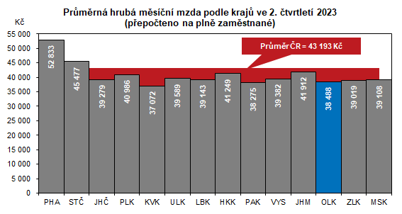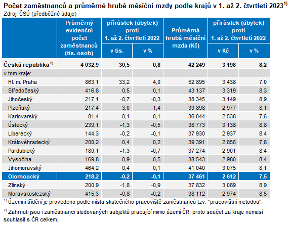 V 1. pololetí letošního roku činila podle předběžných výsledků podnikové statistiky ČSÚ průměrná hrubá měsíční mzda zaměstnanců v Olomouckém kraji 37 461 Kč. Meziročně vzrostla o 2,6 tis. Kč (o 7,5 %), což bylo méně než vypočtený republikový růst (zvýšení o 8,2 %). V mezikrajském srovnání obsadila mzda v kraji třetí nejnižší hodnotu (po Karlovarském a Pardubickém kraji). Za republikovým průměrem (42 249 Kč) byla nižší o 11,3 % a oproti mzdě v kraji s nejvyšší průměrnou mzdou - Praze - byla nižší o více než 15 tis. Kč. Vzhledem k růstu spotřebitelských cen v České republice v 1. pololetí 2023 o 13,7 % klesla reálně mzda v kraji o 5,5 %.