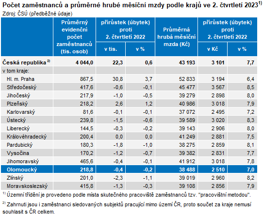 Průměrný evidenční počet zaměstnanců s pracovištěm v Olomouckém kraji ve 2. čtvrtletí 2023 po přepočtu na plně zaměstnané činil 218,8 tis. osob. Ve srovnání s 2. čtvrtletím předchozího roku došlo k jejich poklesu o 0,4 tis. osob (tj. o 0,2 %). K poklesu počtu zaměstnanců došlo téměř ve všech krajích. Naopak výrazné navýšení počtu zaměstnanců bylo zaznamenáno v hlavním městě Praze (zvýšení o 30,8 tis. osob).