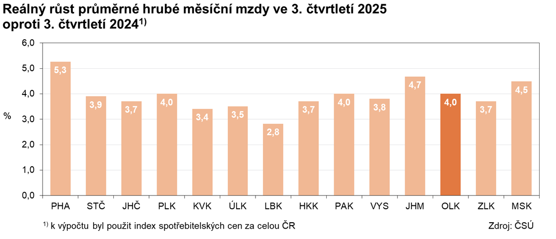 Vzhledem k růstu spotřebitelských cen v České republice ve 3. čtvrtletí 2025 (o 2,5 %) se průměrná hrubá mzda v Olomouckém kraji meziročně reálně zvýšila o 4,0 %. Jednalo se, společně s krajem Plzeňským a Pardubickým, o čtvrtý nejvyšší růst mezi kraji, a to po Praze a krajích Jihomoravském a Moravskoslezském. Nejpomalejší tempo růstu zaznamenal kraj Liberecký. V České republice se reálná mzda ve sledovaném období zvýšila o 4,5 %. Republikový medián mezd dosáhl ve 3. čtvrtletí 2025 částky 42 901 Kč a v případě mužů (45 502 Kč) byl o 5 443 Kč vyšší než v případě žen (40 059 Kč).