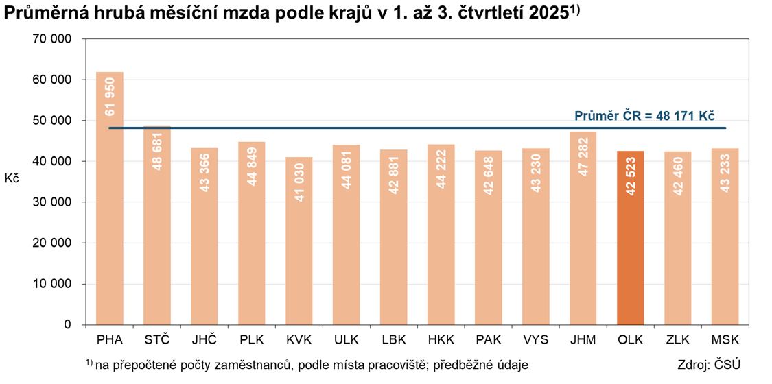 Podle předběžných výsledků podnikového výkaznictví ČSÚ dosáhla v 1. až 3. čtvrtletí 2025 průměrná hrubá měsíční mzda v Olomouckém kraji hodnoty 42 523 Kč. V porovnání se stejným obdobím předchozího roku se zvýšila o 6,5 % (tj. o 2 613 Kč), což bylo pod republikovým tempem (7,1 %). Nominální zvýšení mzdové hladiny zaznamenaly v meziročním pohledu všechny kraje. Nejvyšší průměrná hrubá měsíční mzda byla v Praze (61 950 Kč), naopak nejnižší v kraji Karlovarském (41 030 Kč). Rozdíl mezi krajem s nejvyšší a nejnižší průměrnou mzdovou úrovní tak již dosáhl 20 920 Kč. Průměrná hodnota v Olomouckém kraji byla v 1. až 3. čtvrtletí 2025 třetí nejnižší, a to po krajích Karlovarském a Zlínském. Za republikovým průměrem zaostala o 11,7 % (tj. o 5 648 Kč). S ohledem na meziroční růst spotřebitelských cen v České republice (o 2,5 %) se průměrná mzda v Olomouckém kraji reálně zvýšila o 3,9 %.