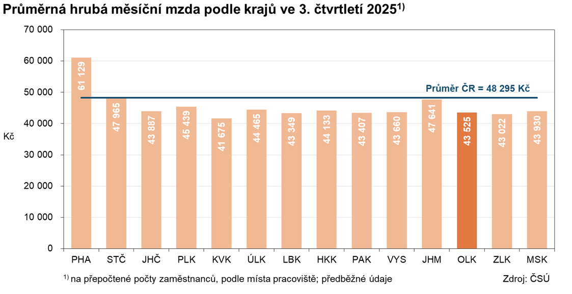 Ve 3. čtvrtletí 2025 dosáhla podle předběžných údajů ČSÚ průměrná hrubá měsíční mzda zaměstnanců přepočtených na plně zaměstnané v podnicích na území Olomouckého kraje úrovně 43 525 Kč. Oproti 3. čtvrtletí 2024 se její nominální hodnota zvýšila o 6,6 % (tj. o 2 692 Kč), což bylo pod republikovým průměrem (7,1 %). Navzdory nižšímu tempu růstu si Olomoucký kraj své postavení v žebříčku krajů vylepšil. Průměrná mzdová hladina zaměstnanců v Olomouckém kraji byla ve sledovaném čtvrtletí 10. nejvyšší mezi 14 kraji. Nižší byla v krajích Karlovarském, Zlínském, Libereckém a Pardubickém. Průměrná hrubá měsíční mzda v Olomouckém kraji byla o 4 770 Kč nižší než v České republice (48 295 Kč) a o 17 604 Kč nižší než v Praze (61 129 Kč).