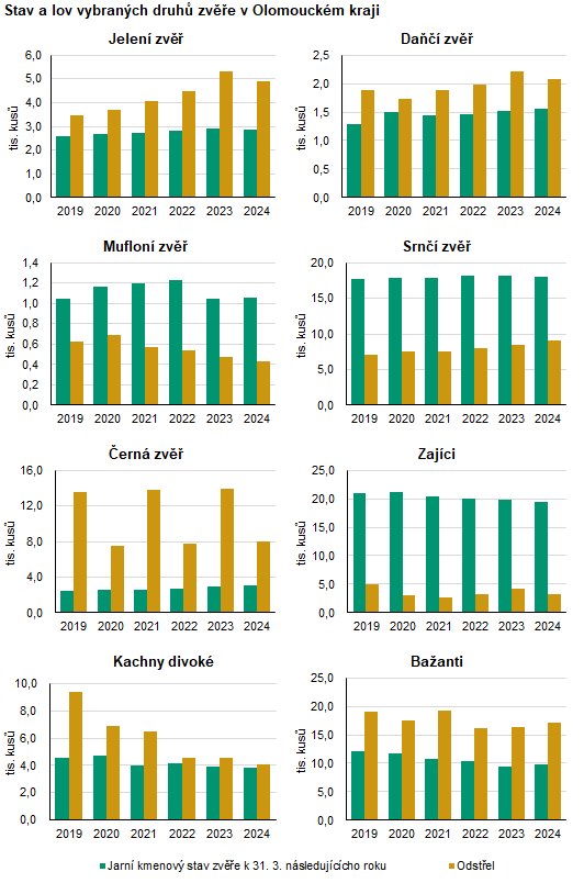 Na území Olomouckého kraje bylo v období od 1. 4. 2024 do 31. 3. 2025 odstřelem uloveno 17,0 tis. kusů bažantů, 9,0 tis. kusů srnčí zvěře, 8,0 tis. kusů černé, 4,9 tis. jelení zvěře, 4,1 tis. kusů kachny divoké, 3,2 tis. kusů zajíců, 2,1 tis. kusů daňčí zvěře a 0,4 tis. kusů mufloní zvěře.