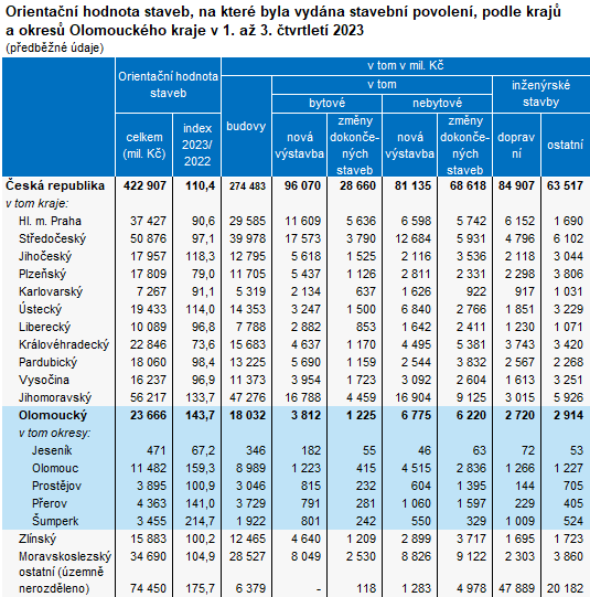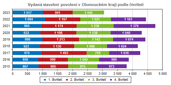 Stavební úřady v Olomouckém kraji vydaly v 1. až 3. čtvrtletí 2023 celkem 3 053 stavebních povolení, oproti stejnému období roku 2022 tak bylo vydáno o 229 povolení méně. Orientační hodnota povolených staveb vzrostla o 43,7 % na 23,7 mld. Kč. Průměrná hodnota na jedno stavební povolení dosáhla 7,8 mil. Kč.