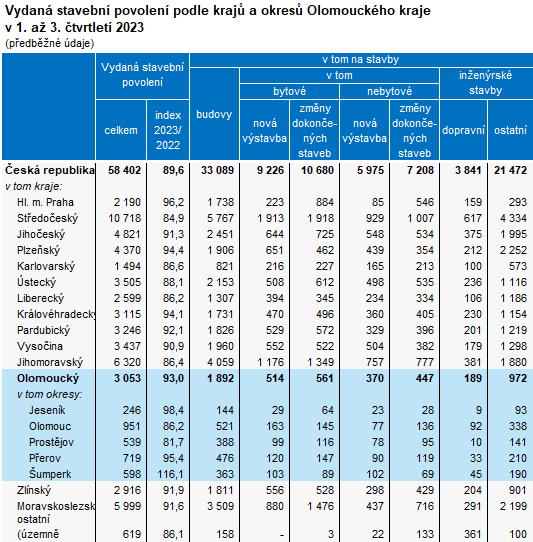 V Olomouckém kraji bylo v 1. až 3. čtvrtletí 2023 vydáno 3 053 stavebních povolení. Oproti stejnému období minulého roku jich bylo o 229 méně, což odpovídalo meziročnímu poklesu o 7,0 %. Počet vydaných povolení na stavby budov klesl na 1 892 (o 180 méně, tj. o 8,7 %) a počet povolení inženýrských staveb se snížil na 1 161 (o 49 méně, tj. o 4,0 %).
