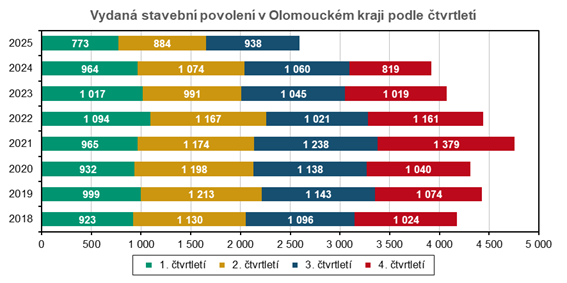 V Olomouckém kraji bylo v během ledna až září 2025 vydáno 2 595 stavebních povolení a ohlášení (dále jen povolení), tzn. o 503 povolení méně než ve stejném období minulého roku (pokles o 16,2 %).