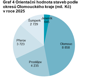 Orientační hodnota staveb, na které byla v roce 2025 v Olomouckém kraji vydána povolení, dosáhla 20 190 mil. Kč, což bylo o 6,2 % (tj. o 1 345 mil. Kč) méně než v roce 2024. S výjimkou Ústeckého a Libereckého kraje došlo ke snížení hodnoty povolených staveb ve všech ostatních krajích, a to i na úrovni celé České republiky (pokles o 13,3 %). Hodnota staveb v Olomouckém kraji představovala 4,0 % republikové orientační hodnoty povolených staveb.