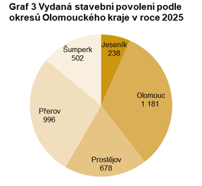 V členění podle okresů bylo v Olomouckém kraji tradičně nejvíce stavebních povolení vydáno v okrese Olomouc (1 181) s orientační hodnotou 8 858 mil. Kč. Meziročně se předpokládaná hodnota povolených staveb zvýšila pouze v tomto okrese (o 7,2 %), zatímco počet vydaných povolení se ve srovnání s rokem 2024 zvýšil pouze v okrese Přerov (o 2,8 %).