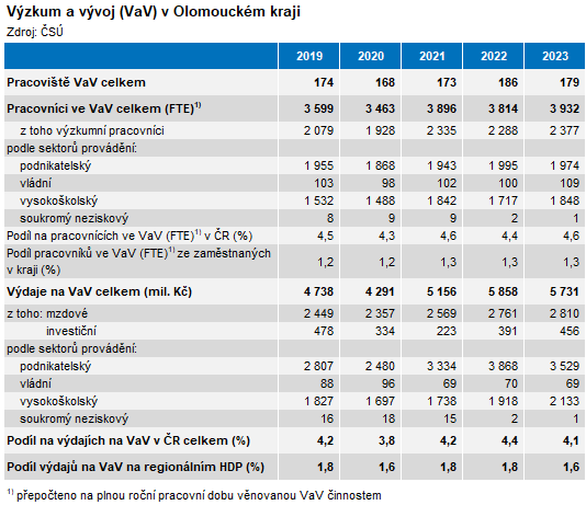 Výzkumem a vývojem se v Olomouckém kraji v roce 2023 zabývalo 3 932 zaměstnanců (přepočteno na plnou roční pracovní dobu věnovanou VaV činnostem). I díky meziročnímu zvýšení o 3,1 % byl jejich počet nejvyšší v celém sledovaném období od roku 2005.