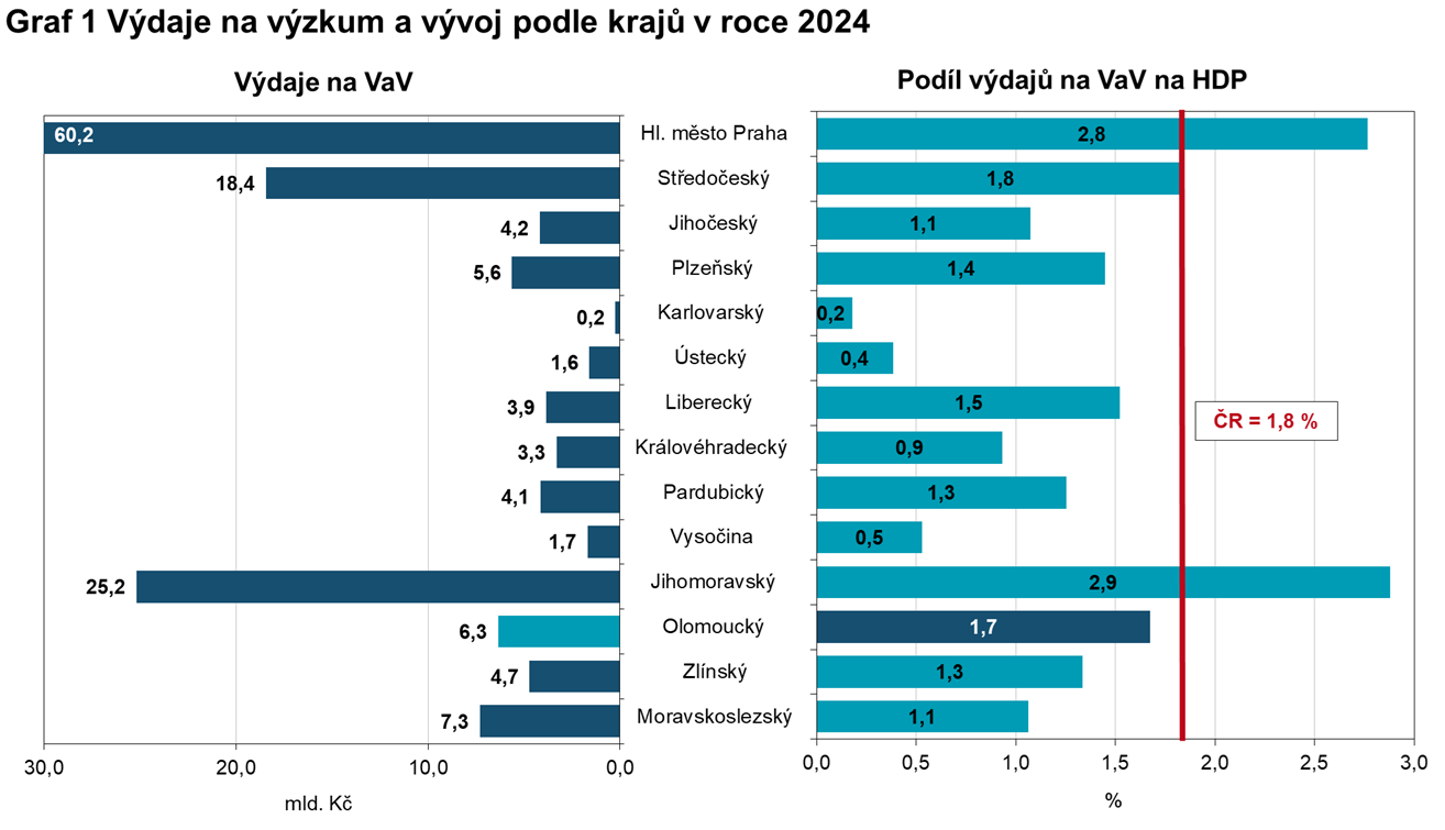 Výdaje na výzkum a vývoj (VaV) v Olomouckém kraji dosáhly v roce 2024 hodnoty 6,3 mld. Kč a byly nejvyšší v historii kraje. Meziroční růst o 10,6 % byl nejvyšší mezi všemi kraji. Nejdůležitějším centrem výzkumu a vývoje v ČR zůstala Praha (60,2 mld. Kč). S odstupem následoval kraj Jihomoravský (25,2 mld. Kč) a Středočeský (18,4 mld. Kč). V těchto třech krajích bylo realizováno 70,7 % všech výdajů na výzkum a vývoj v zemi. Celkové výdaje v České republice se meziročně zvýšily o 5,1 % na 146,9 mld. Kč.