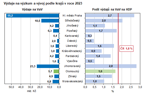 Celkové výdaje na výzkum a vývoj (VaV) v Olomouckém kraji dosáhly v roce 2023 hodnoty 5,7 mld. Kč. V důsledku meziročního snížení o 2,2 % byly druhé nejvyšší v historii kraje. Republikově nejdůležitějším centrem výzkumu a vývoje zůstala Praha (55,2 mld. Kč). S odstupem následoval kraj Jihomoravský (23,3 mld. Kč) a Středočeský (18,5 mld. Kč). V těchto třech krajích bylo realizováno 69,4 % všech výdajů na výzkum a vývoj v zemi. Celkové výdaje v České republice se meziročně zvýšily o 4,8 % na 139,7 mld. Kč.