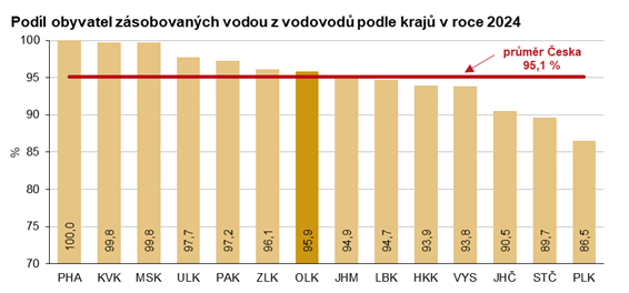 Vodou z veřejného vodovodu bylo v roce 2024 zásobováno 605 260 osob, tj. 95,9 % obyvatel Olomouckého kraje. V mezikrajském srovnání se jednalo o 7. nejvyšší příčku. Nejméně obyvatel napojených na vodovod evidoval Plzeňský kraj (86,5 %), naopak 100% napojení vykázalo hlavní město Praha.