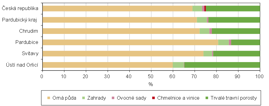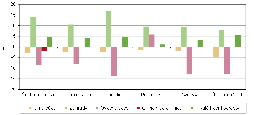Ve srovnání s koncem roku 2014 se ve struktuře zemědělské půdy v Pardubickém kraji snížilo zastoupení orné půdy (o 1,5 procentního bodu) a naopak vzrostlo zastoupení trvalých travních porostů (o 1,1 procentního bodu) a zahrad (o 0,5 procentního bodu). Celostátně byla situace velmi podobná, podíl orné půdy se na celkové výměře zemědělské půdy v tomto období snížil o 1,7 procentního bodu, podíl trvalých travních porostů se zvýšil o 1,2 procentního bodu a podíl zahrad vzrostl o 0,6 procentního bodu.