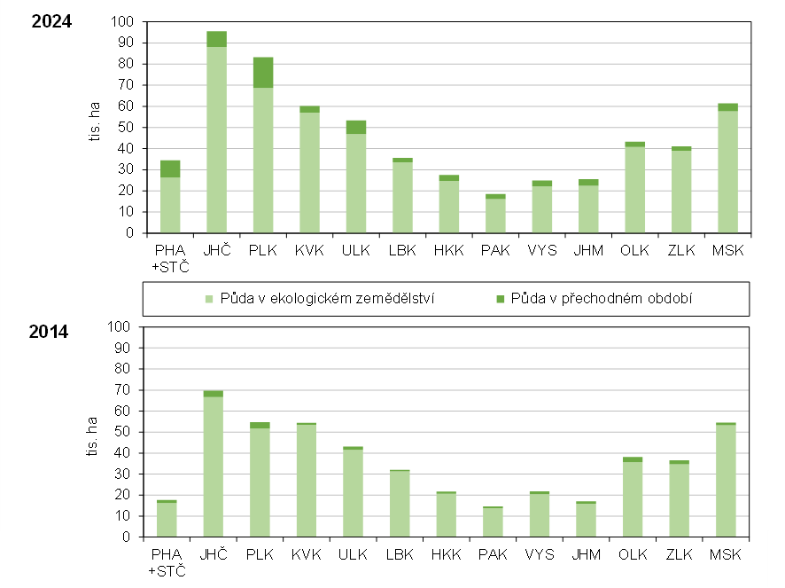 Plocha využívaná pro ekologickou zemědělskou produkci tvořila v Pardubickém kraji ke konci roku 2024 téměř 16,2 tis. hektarů (tj. nejnižší hodnota mezi kraji), na dalších 2,3 tis. hektarech se pak nacházela půda v přechodném období (tj. v přesně stanovené době, ve které dochází k přechodu od konvenčního zemědělství na zemědělství ekologické).