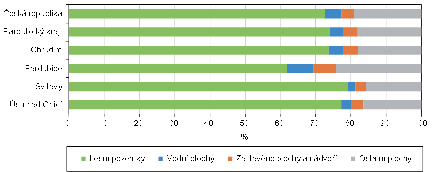 Také ve většině správních obvodů obcí s rozšířenou působností v kraji měly ve struktuře nezemědělské půdy ke konci roku 2024 největší zastoupení lesní pozemky. Ty se ve čtrnácti z patnácti správních obvodů v kraji podílely na nezemědělské půdě více než šedesáti procenty. Zatímco nejvyšší zastoupení lesních pozemků na nezemědělské půdě mělo mezi správními obvody v kraji Králicko (85,0 %) a Holicko (84,3 %), nejnižší podíl lesních pozemků připadal na Pardubicko (38,7 %).