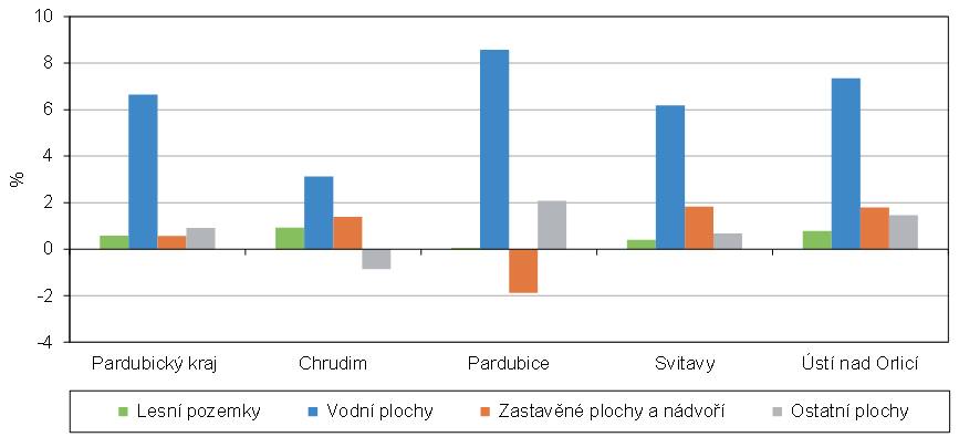 Podíl nezemědělské půdy se na celkové výměře kraje oproti konci roku 2014 zvýšil o 0,3 procentního bodu, což se v kraji projevilo zejména ve vysokém procentním nárůstu rozlohy vodních ploch (o 6,6 %), ale též v nárůstu rozlohy ostatních ploch (o 0,9 %), lesní půdy (o 0,6 %) a zastavěných ploch a nádvoří (o 0,6 %). Také celostátně se podíl nezemědělské půdy na celkové výměře v tomto období zvýšil (shodně o 0,3 procentního bodu), což se projevilo též především ve vyšším procentním nárůstu rozlohy vodních ploch (o 4,1 %). Celostátně se zvýšila také celková výměra zastavěných ploch a nádvoří (o 2,9 %) a rovněž lesní půdy (o 0,6 %). Celková výměra ostatních ploch se v Česku naopak snížila (o 0,4 %).