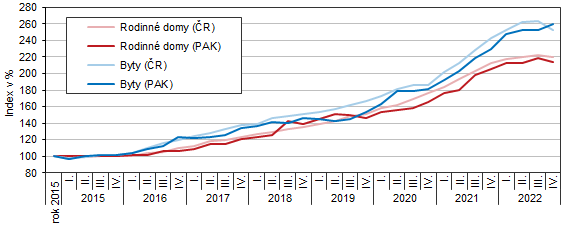 Informaci o vývoji cen nemovitostí v Pardubickém kraji a v České republice poskytuje časová řada cenových indexů v jednotlivých čtvrtletích s bazickým rokem 2015. Celostátně zaznamenáváme plynulý nárůst u cen rodinných domů i bytů s kulminací a následným poklesem v roce 2022. Ve sledovaném období ceny bytů v ČR rostly strměji než ceny rodinných domů a pokles na konci roku 2022 byl u bytů výraznější než u rodinných domů. Krajské hodnoty cen nemovitostí většinou kopírovaly republikové trendy. Pouze ve 4. čtvrtletí roku 2022 tempo růstu cen bytů na krajské úrovni nezpomalilo a index cen bytů v kraji byl vyšší (259,7 % proti průměru roku 2015) než na celostátní úrovni (252,9 %).