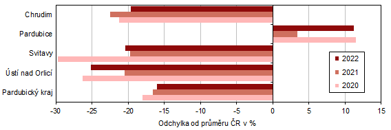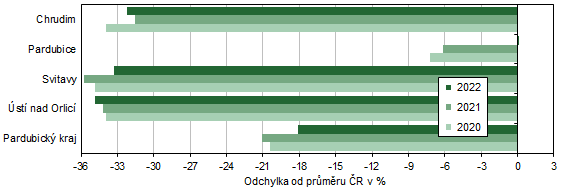 Z výše přiloženého grafu je patrné, že při porovnání kupních cen bytů ve všech okresech kraje s celostátním průměrem byly ceny nižší ve všech sledovaných letech 2020, 2021 a 2022. Výjimku představuje rok 2022, kdy ceny bytů v okrese Pardubice jen nepatrně převýšily cenu republikového průměru (+0,03 %). Nejvyšší rozdíl byl dosažen v okrese Svitavy (-35,7 %) v roce 2021.