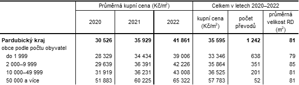 Průměrná velikost prodávaných rodinných domů v období let 2020–2022 činila na celostátní úrovni 88 m2, v Pardubickém kraji dosáhla hodnoty 81 m2. Rozlohou nejmenší rodinné domy v kraji v závislosti na velikosti obcí dle počtu obyvatel se prodávaly v nejmenších obcích do 2 tisíc obyvatel a měly průměrnou velikost 79 m2. Největší rodinné domy s průměrnou velikostí 85 m2 se prodávaly v obcích od 2 do 10 tisíc obyvatel.