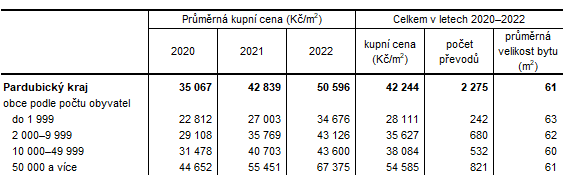 Průměrný počet převodů bytů se v kraji výrazně liší dle jednotlivých okresů. V pardubickém okrese byl v letech 2020–2022 evidován téměř 50% objem prodejů bytů realizovaných v rámci kraje, na druhém místě se umístil okres Ústí nad Orlicí (21,3 %) a nejméně převodů bylo zaznamenáno v okrese Svitavy (15,2 %). Nejčetnější prodeje bytů v závislosti na velikosti obcí proběhly v největším městě kraje Pardubicích (50 tisíc obyvatel a více) a v obcích od 2 do 10 tisíc obyvatel.