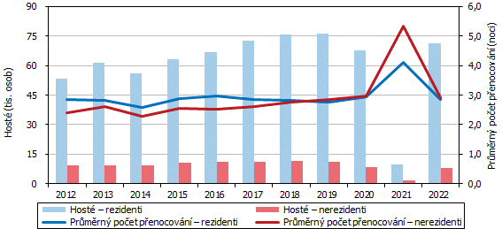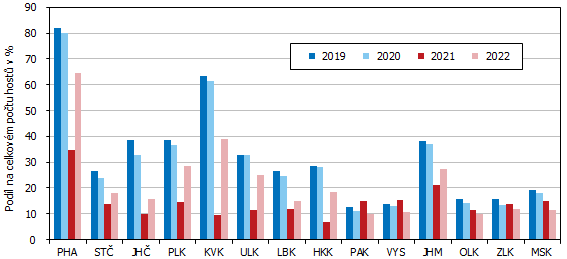 Oproti 1. čtvrtletí 2019 byl počet přenocování v kraji o 6,6 % nižší s poklesem v případě domácích i zahraničních hostů; v celé ČR došlo k 26,0% snížení (vlivem nižšího počtu přenocování pouze u nerezidentů). Průměrný počet přenocování na jednoho hosta v 1. čtvrtletí 2022 v kraji (2,9 noci) byl mírně nad republikovým průměrem (2,8 noci).