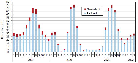 Oproti prvnímu čtvrtletí roku 2021 se v kraji zvýšil počet hostů z ČR, tzv. rezidentů3 7,2násobně na 71,2 tisíc. Hostů ze zahraničí, tzv. nerezidentů4 přicestovalo do kraje v 1. čtvrtletí letošního roku 7,9 tisíc, což sice bylo meziročně 4,6x více, ve srovnání s předchozími roky se však jednalo o podprůměrný počet (v letech 2016 až 2019 se v kraji v tomto období ubytovávalo více než 11 tisíc nerezidentů).