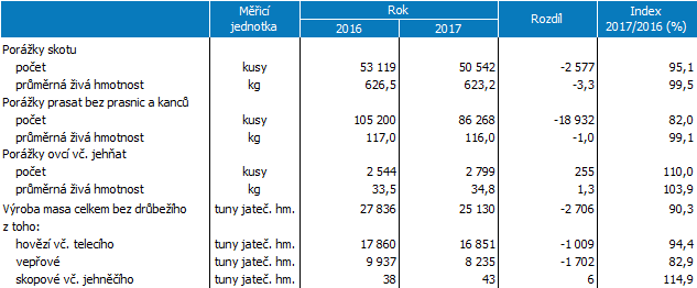 Celostátně se výroba masa (bez drůbežího) meziročně snížila o 13,5 tis. tun (o 4,6 %), přitom největší vliv na to měl pokles výroby vepřového masa (o 9,3 tis. tun, tj. o 4,2 %). V kraji výroba masa v roce 2017 poklesla o 2,7 tis. tun (o 9,7 %); v absolutním vyjádření zaznamenal v mezikrajském srovnání vyšší meziroční úbytek výroby masa pouze Plzeňský kraj. Pokles výroby vepřového masa byl v kraji o 700 tun vyšší než pokles výroby hovězího masa. Výroba masa meziročně v roce 2017 vzrostla pouze ve Středočeském kraji, přitom ve výrobě hovězího masa byl zaznamenán růst ještě v Jihomoravském a Ústeckém kraji a vepřového masa v Královéhradeckém kraji.