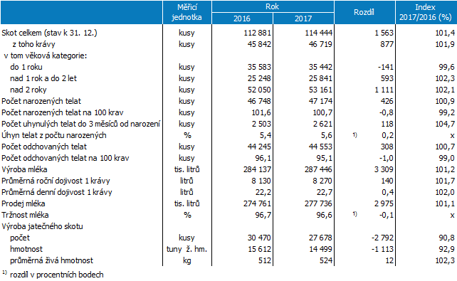- Chov skotu - 2. pololetí 2017Chov skotu v základních ukazatelích: početní stavy skotu podle věkových kategorií a podle pohlaví, počty krav dojených a krav bez tržní produkce mléka, natalita a úhyny telat, průměrná dojivost krav, výroba a prodej mléka, výroba jatečného skotu.