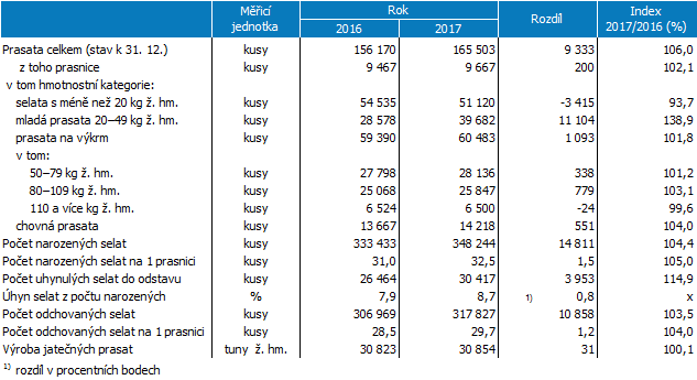 - Chov prasat - k 31. 12. 2017Chov prasat v základních ukazatelích: početní stavy prasat podle hmotnostních kategorií a účelu chovu, narození a úhyny selat, počty oprasených prasnic a prasniček, počty narozených a odchovaných selat na prasnici, výroba jatečných prasat.