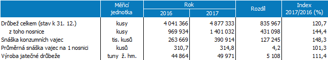 - Chov drůbeže - 2017Roční výsledky v základních ukazatelích: početní stavy drůbeže, z toho slepic, výroba vajec, výroba jatečné drůbeže.