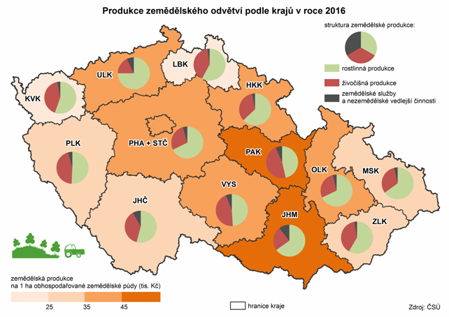 Na živočišné produkci kraje se v roce 2016 z 51 % podílela zvířata, z toho skot 13 %, prasata 17 % a drůbež 21 %. Živočišné výrobky tvořily 49 % živočišné produkce kraje, v tom mléko tvořilo 40 % a vejce 9 %. Vysoká produkce drůbeže přispěla k tomu, že měl kraj i v roce 2016 v mezikrajském srovnání nejvyšší objem nejen živočišné produkce, ale i celkové zemědělské produkce na hektar obhospodařované zemědělské půdy. Data o zemědělské produkci za rok 2017 ve finančním vyjádření budou k dispozici až ve 4. čtvrtletí 2017.