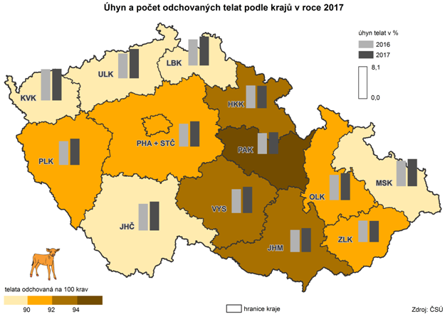 Počet narozených telat na 100 krav se v roce 2017 oproti roku předchozímu snížil v deseti krajích včetně Pardubického, přesto zůstala krajská hodnota 100,7 narozených telat na 100 krav nejvyšší mezi všemi kraji v ČR.