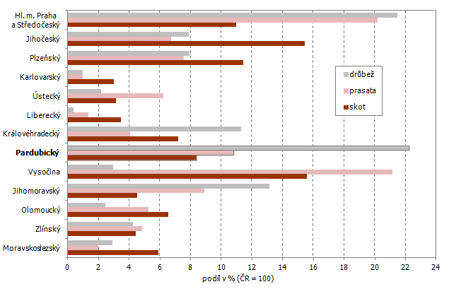 Největší meziroční změny byly v roce 2017 na regionální úrovni zaznamenány ve stavech drůbeže. Celostátně stavy drůbeže vzrostly o 0,9 %, přitom v Pardubickém kraji stavy vzrostly o 20,7 %. Ještě rychleji rostly stavy drůbeže ve Středočeském kraji (o 30,9 %), naproti tomu v Plzeňském kraji meziročně poklesly stavy téměř o polovinu. Tyto výkyvy souvisejí s poměrně krátkým cyklem výroby jatečné drůbeže.
