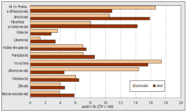 Na rozdíl od celostátního poklesu stavu prasat byl v roce 2010 v kraji zaznamenán růst o 14,6 %. Oproti úhrnu za celou ČR, kde se snižovaly stavy ve všech hmotnostních i účelových kategoriích, s výjimkou prasat na výkrm o hmotnosti nad 110 kg, se v kraji zvýšily početní stavy ve všech hmotnostních i účelových kategoriích, s výjimkou prasat na výkrm o hmotnosti 80 - 109 kg.